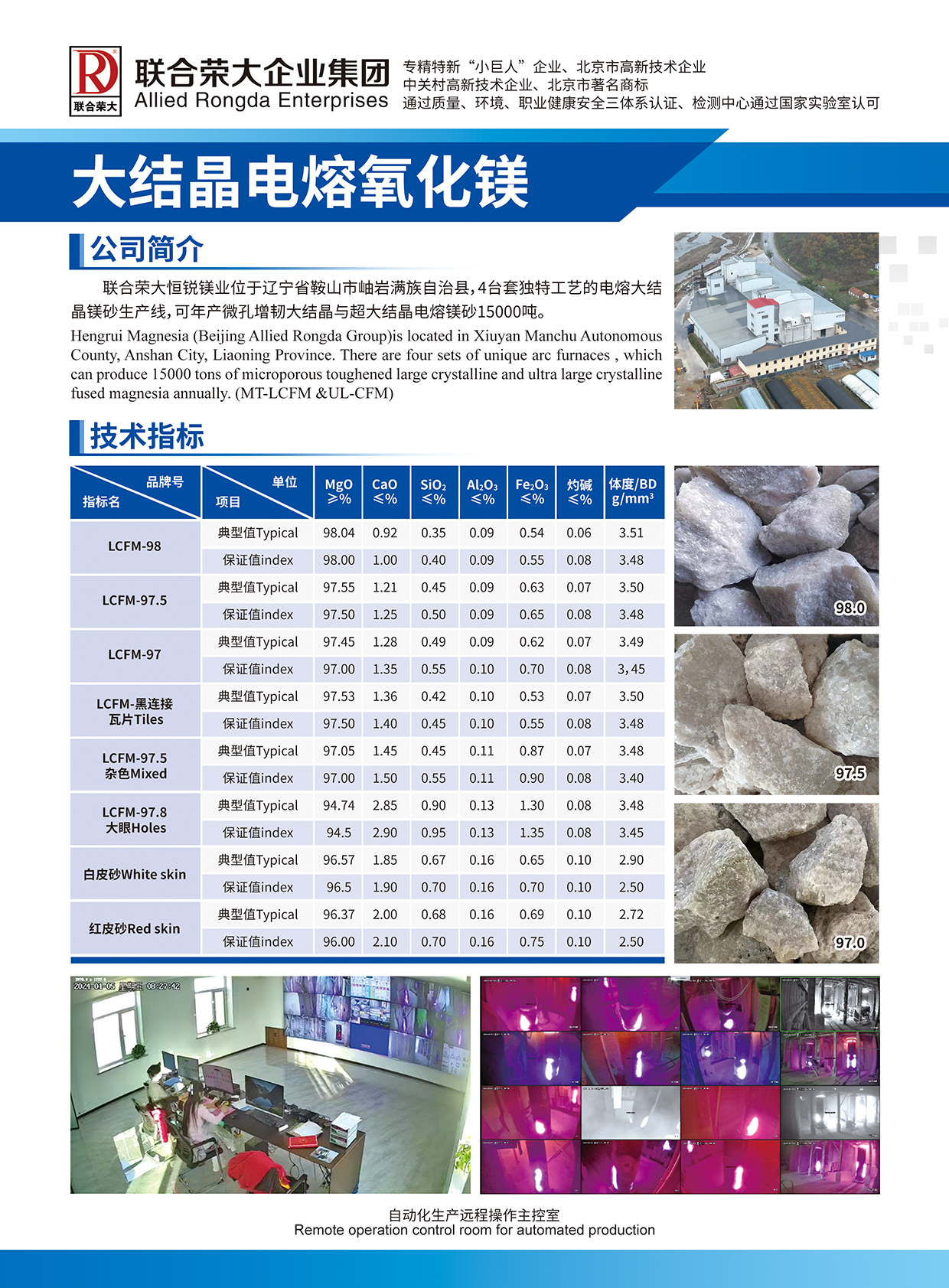 Hengrui Magnesia Beijing Allied Rongda Groupis located in Xiuyan Manchu Autonomous County, Anshan City, Liaoning Province. There are four sets of unique arc furnaces , which can produce 15000 tons of microporous toughened large crystalline and ultra large crystalline fused magnesia annually. (MT-LCFM &UL-CFM)